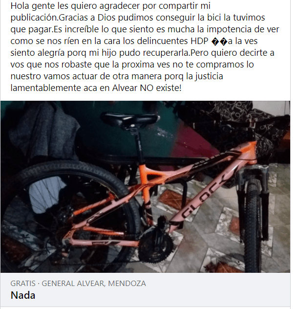 Finalmente, la mujer contó que había recuperado la bicicleta tras pagarle a los delincuentes una suma de dinero: